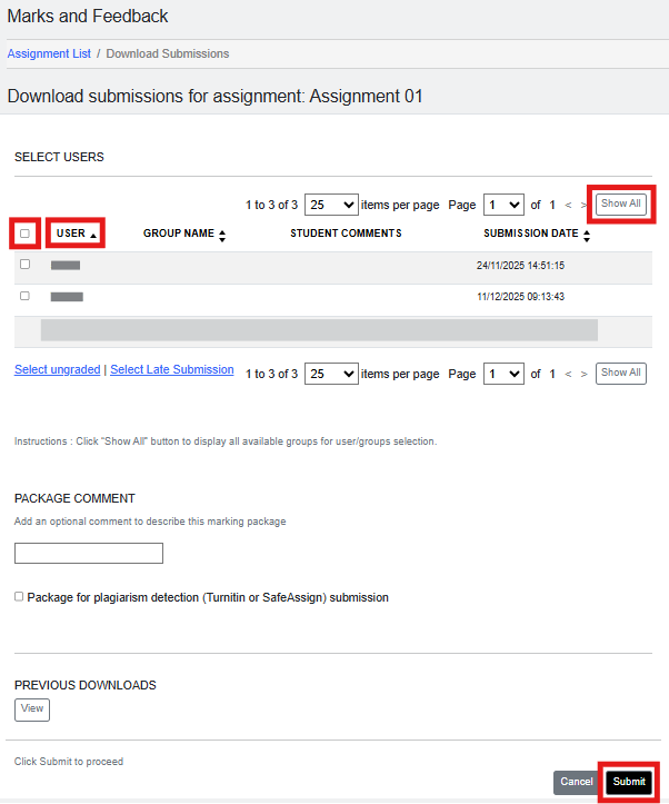 - You could click Show All and select all users. We also suggest clicking USER to sort the Student IDs in ascending order before downloading the package, so the Student IDs listed in the Excel file mentioned below will be in ascending order as well. Leave Package for plagiarism detection (TurnItIn or SafeAssign) submission blank under Package Comment. Click Submit.