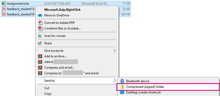 - Then, select the Excel file and all students’ feedback files, and zip them as .zip file. (Important: If the .zip file exceeds 200MB, please complete the process in batches. You can check its size by right clicking the .zip file and selecting 'Properties'.)