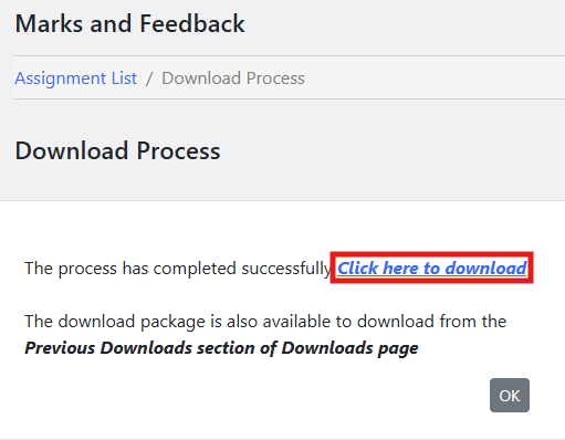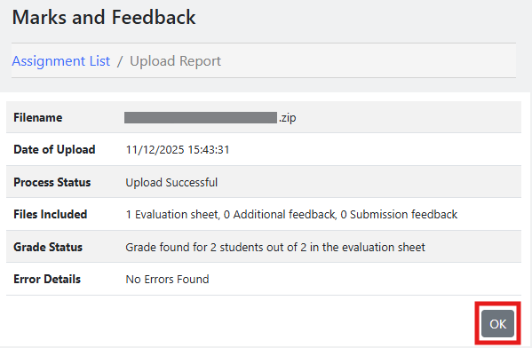 - You will see Upload successful. Make sure all grades and feedback files are uploaded, and there are no errors before you proceed. Click OK to proceed.