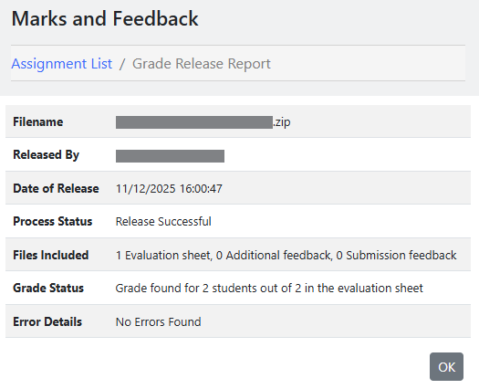- If you are releasing the grades again, please re-check the feedback file names - they should be unique when compared with previous processed ZIP files. If processed with same feedback file names, those would be appended with a random string to maintain uniqueness.