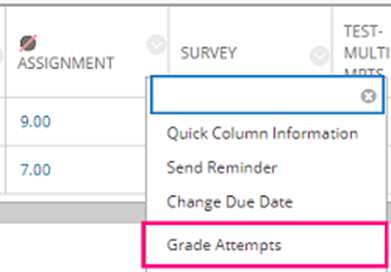 - Go to 'Grade Center' > 'Assignments' (or ‘Full Grade Center’). Find the assignment column and check the grades. Click the chevron next to the assignment name and click ‘Grade Attempts’.