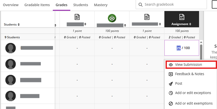 - Go to Gradebook > Grades > Find the assignment column and check the grades. Select a graded cell from a student > View Submission.