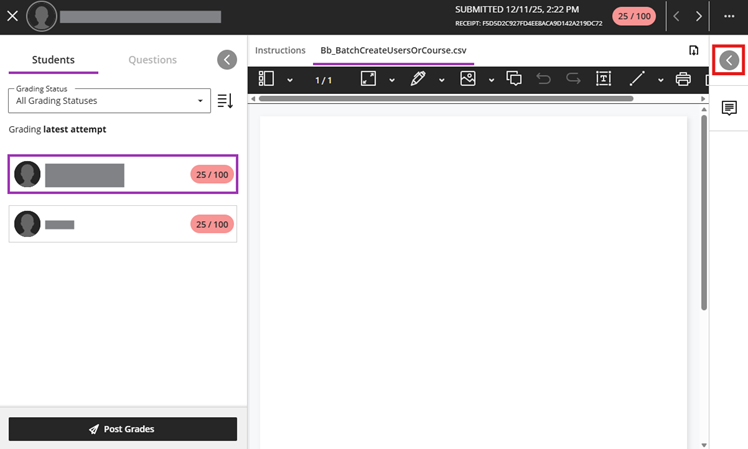 - Click this arrow to open the slide. You will be able to see the feedback file and feedback comment here for current selected student.